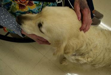 One resident who took a particular fondness to Mercedes was a man in a wheelchair whose hands were no longer able to move well, possibly due to a stroke or severe rheumatoid arthritis. When he saw Mercedes, his eyes lit up and his rigid hands reached out struggling to grasp Mercedes' coat working hard to pet the lovely creature.