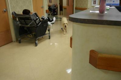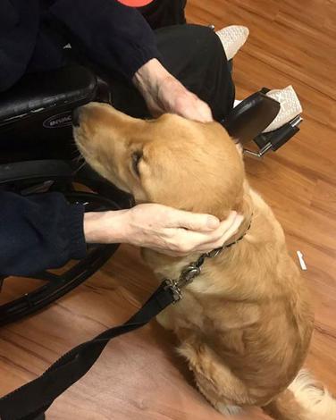 Poppy, a Daisy offspring registered with Therapy Dogs International, met a man at a nursing home in 2017. He teared up as he talked of falling and breaking his hip. His Labrador Retriever did not leave his side as he laid outside in the rain for six hours with a broken hip. Finally, a neighbor found him and called 911. His son was taking care of his dog while he recovered in the rehabilitation center. Poppy brought a smile to the man's face for a few brief moments. Yet another of many, many wonderful connections with the elderly.